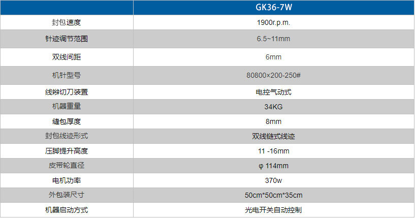 GK36-7W全自動(dòng)雙針?biāo)木€全自動(dòng)封包機(jī)采用雙機(jī)針縫合,一次縫兩趟線,牢固可靠,可實(shí)現(xiàn)無(wú)泄漏封包,適合于對(duì)縫口有嚴(yán)格要求的廠家對(duì)紙袋、塑編袋、布袋等的封包縫口。采用 光電開(kāi)關(guān)自動(dòng)控制啟停機(jī)、電控氣動(dòng)式切刀自動(dòng)剪切線辮,適合于自動(dòng)化程度較高的化工廠、倉(cāng)庫(kù)、碼頭等流水線縫包。